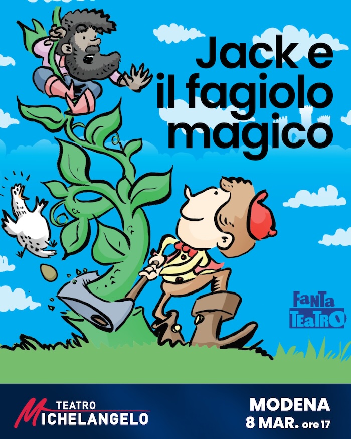 Teatro Michelangelo Via Giardini 257, Modena📆 8 MARZO ORE 17:00 al 𝗧𝗲𝗮𝘁𝗿𝗼 𝗠𝗶𝗰𝗵𝗲𝗹𝗮𝗻𝗴𝗲𝗹𝗼 Jack scambia la sua mucca per un fagiolo magico e, incredulo, assiste alla crescita di una pianta gigante che lo porta in un mondo sospeso tra le nuvole. Qui dovrà sfidare un terribile gigante. 𝗨𝗻 𝗰𝗹𝗮𝘀𝘀𝗶𝗰𝗼 𝘀𝗲𝗻𝘇𝗮 𝘁𝗲𝗺𝗽𝗼 che parla di coraggio, astuzia e un pizzico di magia, perfetto per far sognare grandi e piccini. Fantateatro porta in scena questa famosissima fiaba utilizzando una tecnica scenografica di 𝗮𝗻𝗶𝗺𝗮𝘇𝗶𝗼𝗻𝗲 𝗱𝗶 𝗱𝗶𝘀𝗲𝗴𝗻𝗶 𝗱𝗮𝗹 𝘃𝗶𝘃𝗼 che permettono a Jack di essere sia attore in scena che cartone animato.