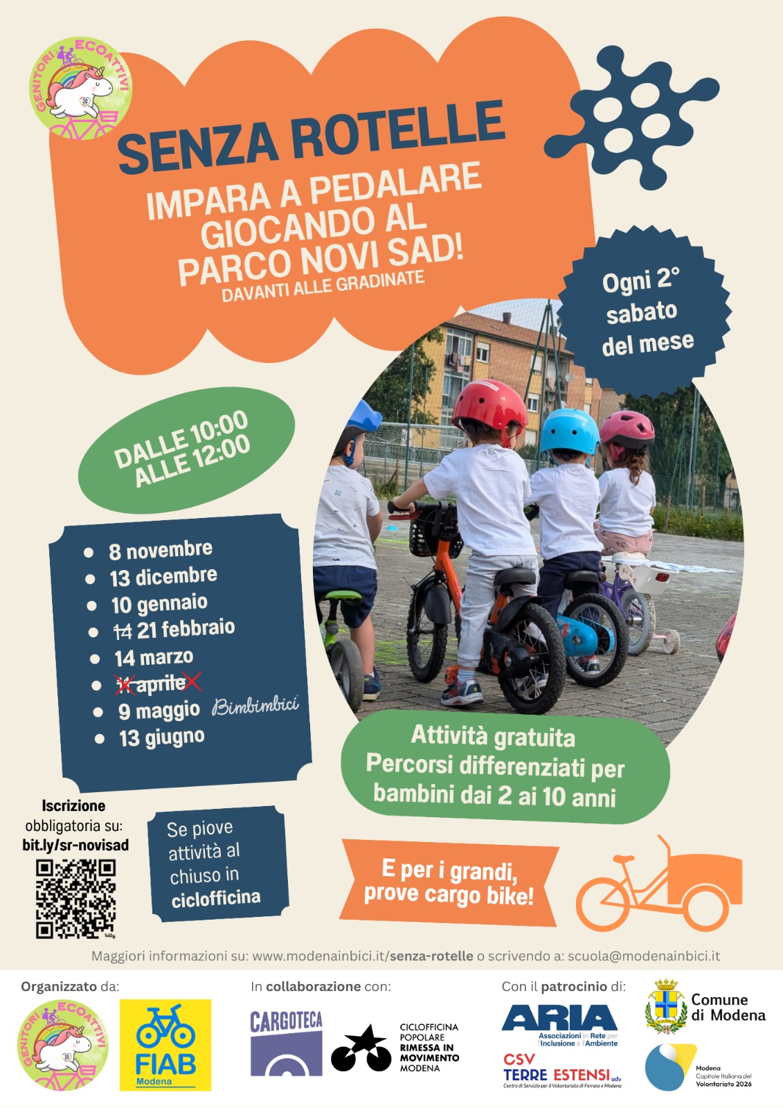 🚲 𝗦𝗲𝗻𝘇𝗮 𝗥𝗼𝘁𝗲𝗹𝗹𝗲 diventa un appuntamento fisso al Parco Novi Sad (davanti alle gradinate): 𝗼𝗴𝗻𝗶 𝘀𝗲𝗰𝗼𝗻𝗱𝗼 𝘀𝗮𝗯𝗮𝘁𝗼 𝗱𝗲𝗹 𝗺𝗲𝘀𝗲, fino a giugno, a partire dall’8 novembre. Evento per famiglie: 𝗯𝗮𝗺𝗯𝗶𝗻𝗶 𝗲 𝗯𝗮𝗺𝗯𝗶𝗻𝗲 𝗱𝗮𝗶 𝟮 𝗮𝗻𝗻𝗶 in su possono imparare e divertirsi in bici. Supporto anche per genitori e adulti che vogliono iniziare o migliorare per pedalare in sicurezza.