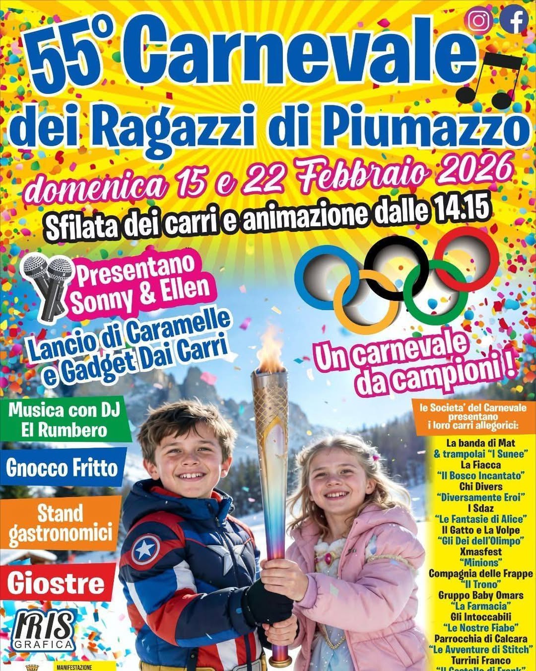 Protagonista assoluta sarร la tradizionale sfilata dei carri allegorici, accompagnata da animazione, spettacoli e tanto divertimento. A guidare la festa saranno i fantastici Sonny & Ellen, mentre dai carri pioveranno caramelle e gadget per la gioia dei piรน piccoli. La colonna sonora del pomeriggio sarร affidata a DJ El Rumbero, per un carnevale tutto da ballare.