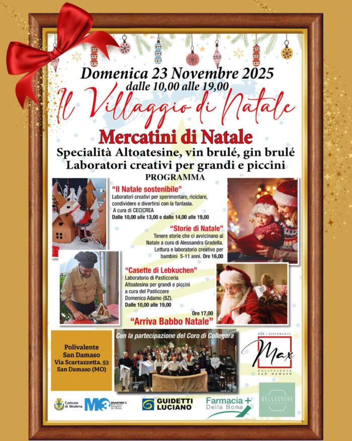 Domenica 23 novembre 2025, dalle 10.00 alle 19.00, la Polivalente di San Damaso (via Scartazzetta 53, Modena) si trasforma in un vero e proprio villaggio natalizio ricco di magia, profumi e creatività. 🎅 🎄