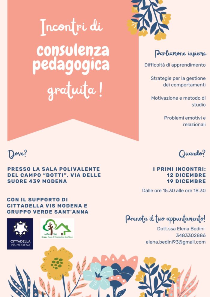 Incontri di consulenza pedagogica gratuiti per le famiglie di Modena per parlare insieme di temi quali: metodo di studio, strategie per gestire i comportamenti, difficoltà di apprendimento, problemi emotivi.