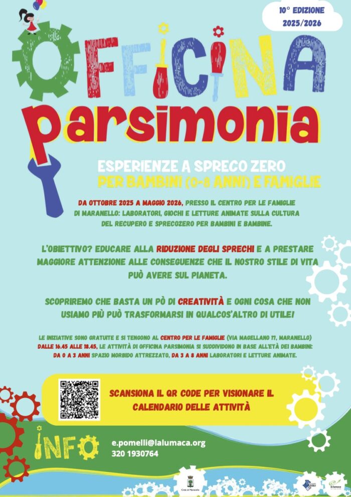 Officina Parsimonia è un progetto che prevede laboratori, giochi e letture animate sulla cultura del recupero, con l’obiettivo di educare alla riduzione degli sprechi e a prestare maggiore attenzione alle conseguenze che il nostro stile di vita può avere sul pianeta. Le attività cadono sempre di venerdì, festivi esclusi, dal 31 ottobre a metà maggio.
