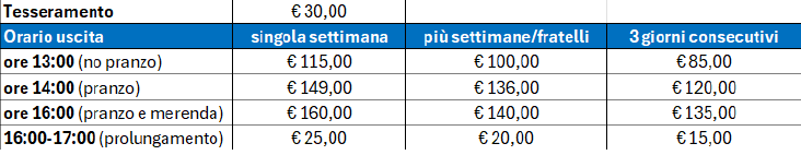 Prolungamento: dalle 16:00 alle 17:00, attivabile previo raggiungimento minimo di partecipanti